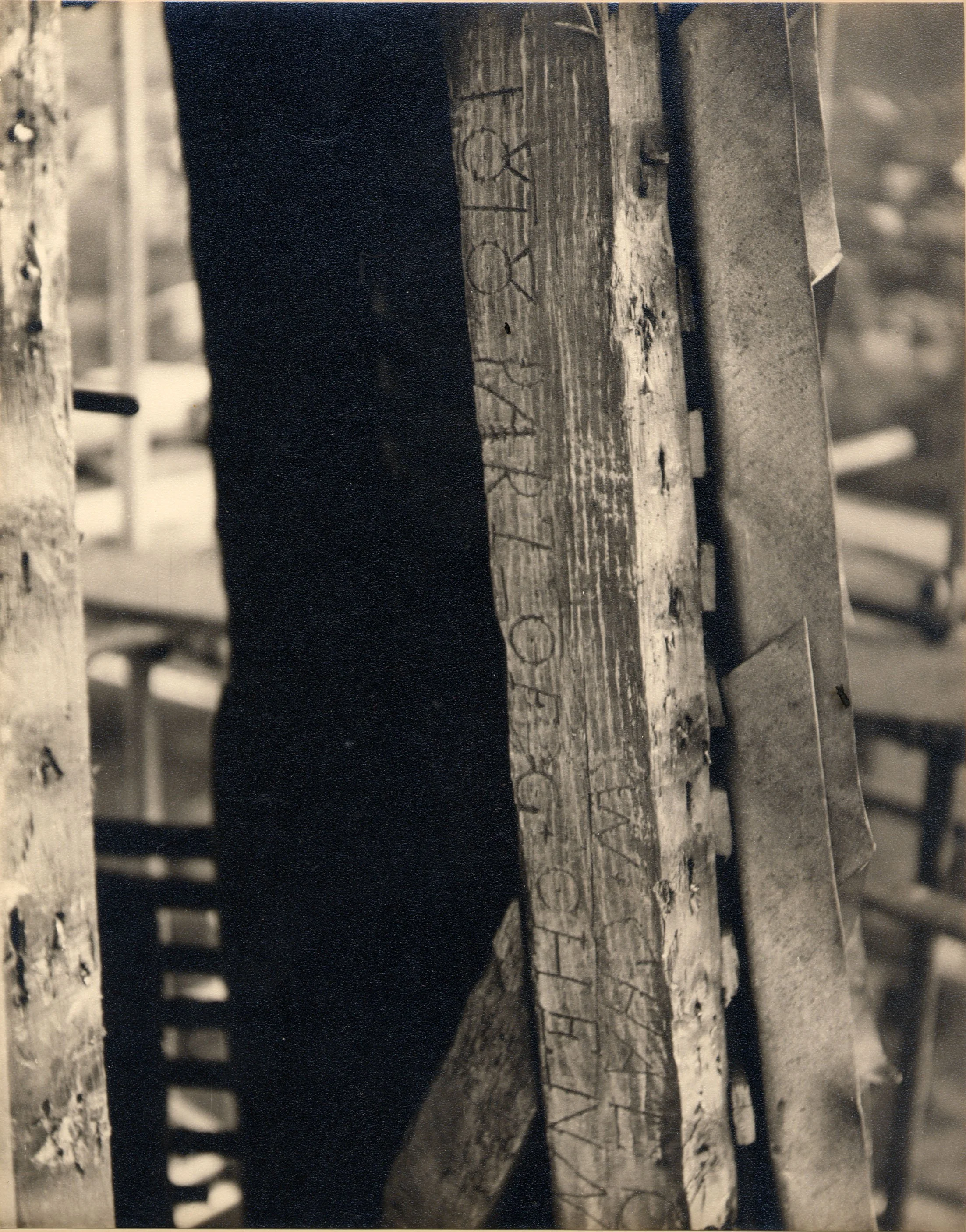 Photograph taken during the repair to the spire of St Peter and St Paul Church Godalming in 1955, showing the wooden beam in the tower which was used for the last hanging in Godalming on the Lammas Lands of Chennell and Chalcroft in 1818.