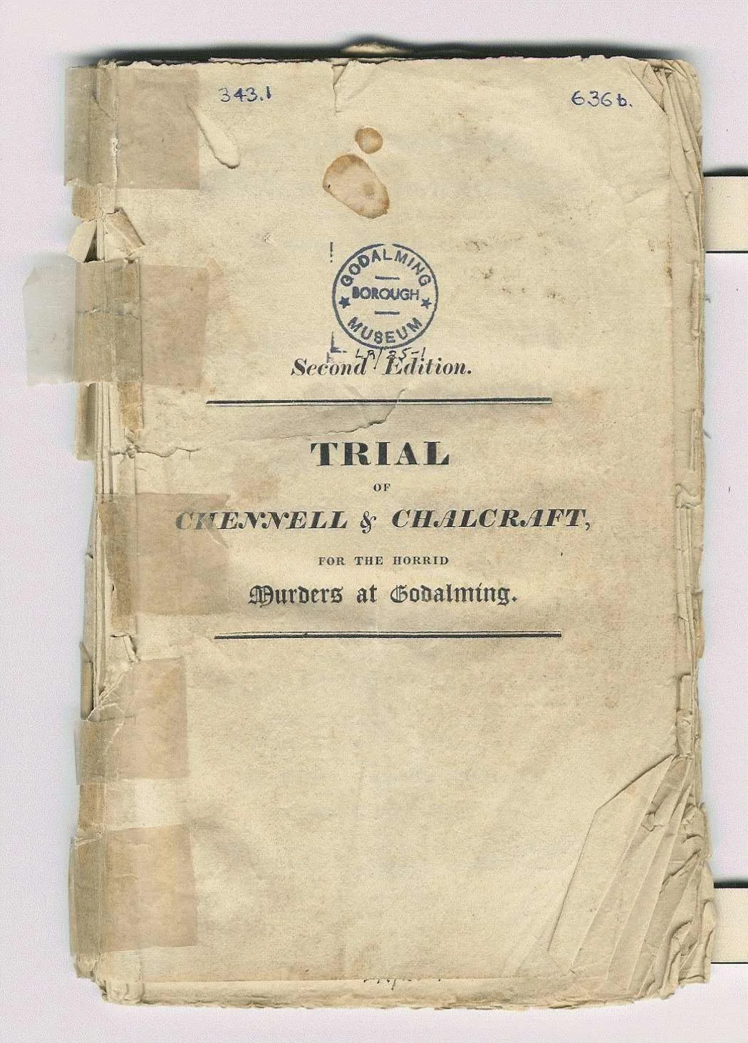 Trial of George Chennell and W Chalcraft, For the most horrid Murder, of Mr George Chennell Sen (father of the prisoner G Chennell) and of Elizabeth Wilson (His House-keeper) at Godalming, who were convicted at the Summer Assize at Guildford, before Mr Sergeant Lens, on Wednesday the 12th of August, 1818, to which is added an account of their execution, &c. Includes a sketch and floor-plan of George Chennell's house on Godalming High Street.