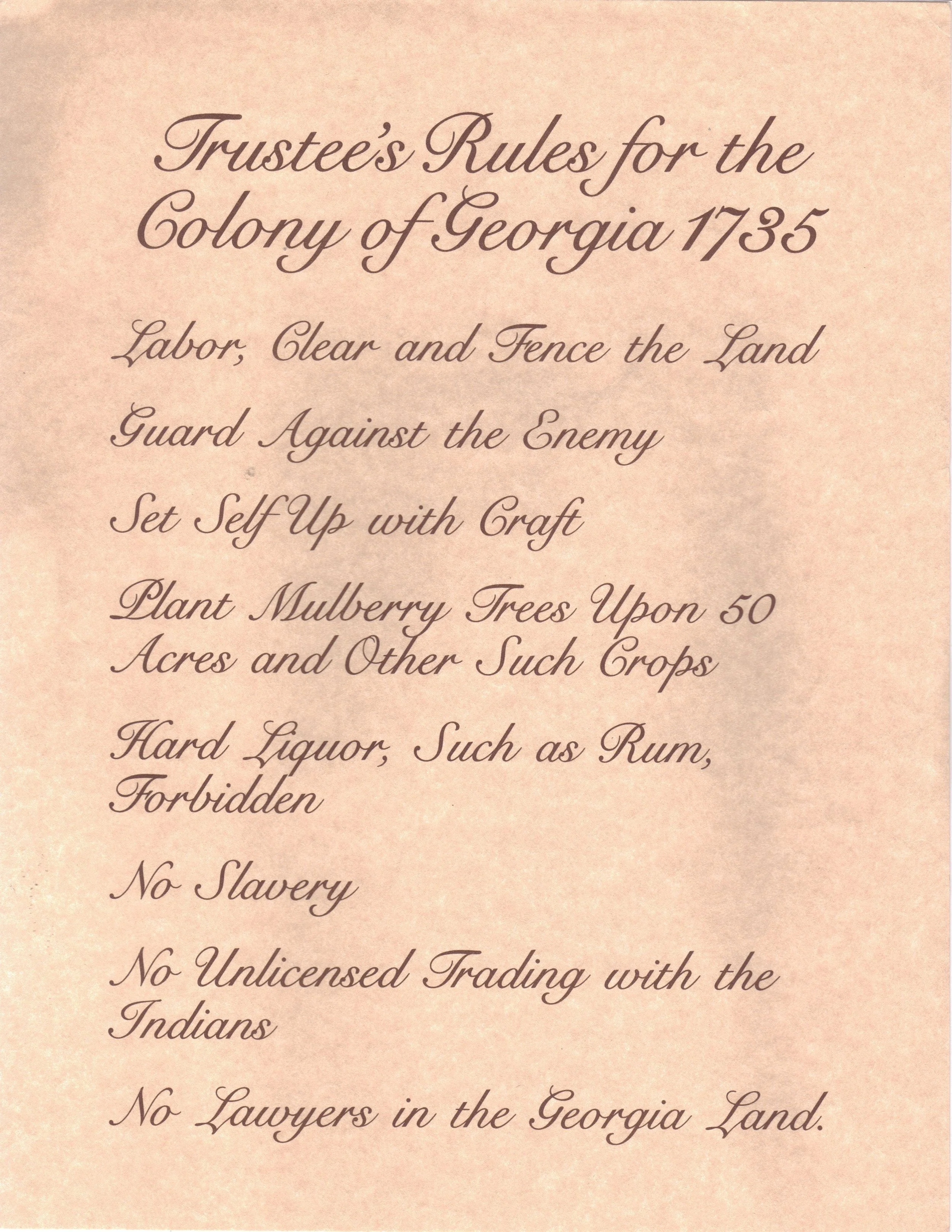 Modern production, notice of the Trustees Rules for the Colony of Georgia, 1735,