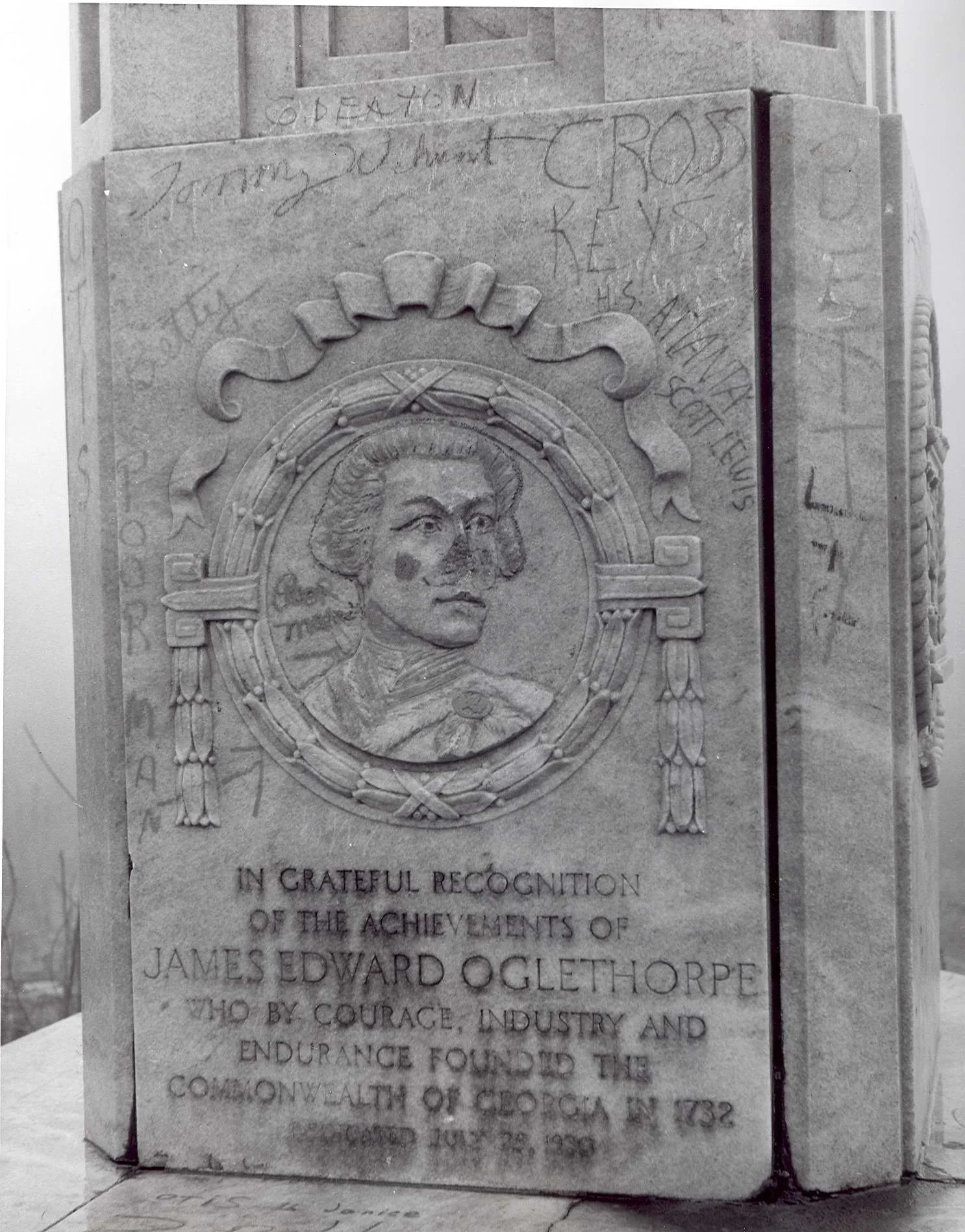Mounted black and white photograph of the memorial to General James Oglethorpe erected on Mount Oglethorpe, Georgia, 28th July 1930. Detail of the plinth. The memorial itself is a 38 ft high shaft of marble, given by Col Sam Tate, President of the Georgia Marble Company. Photograph by the Atlanta Journal and Constitution Magazine