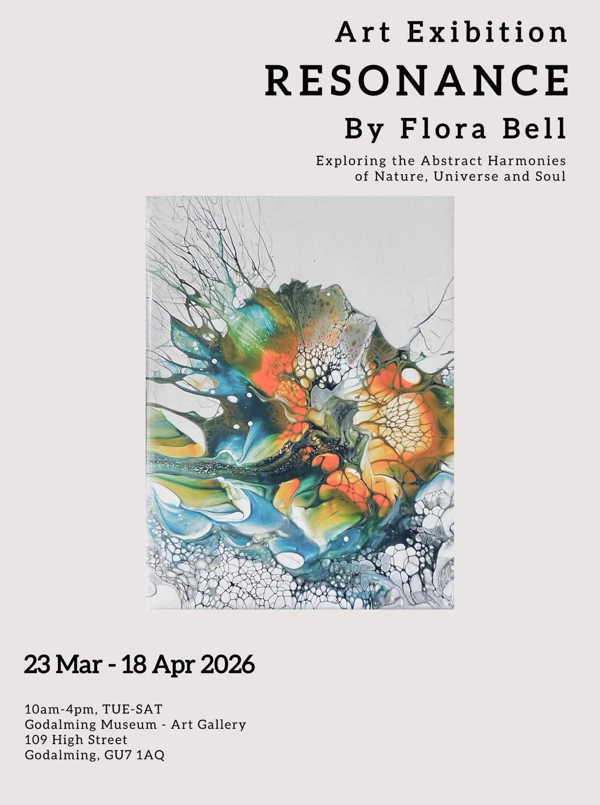 Resonance is Flora Bell’s first solo exhibition, bringing together abstract paintings created over the past three years, including the Seasons of Becoming series. Working with fluid acrylic techniques, Bell balances control and spontaneity to create compositions that feel dynamic yet composed. Through the organic movement of paint, her works suggest landscape and seascape, earth and sky. The Seasons of Becoming series explores inner change: from intensity and uncertainty, through grounding and self-awareness, to confidence, openness and mature harmony. Together the exhibition explores these stages of change, revealing a visual language shaped by growth, intention and a search for balance.